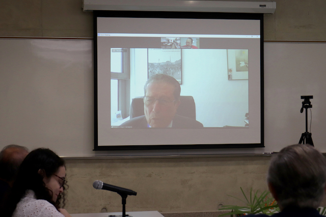 En pantalla, el Dr. Federico Mayor Zaragoza desde Madrid, conversando con miembros de
