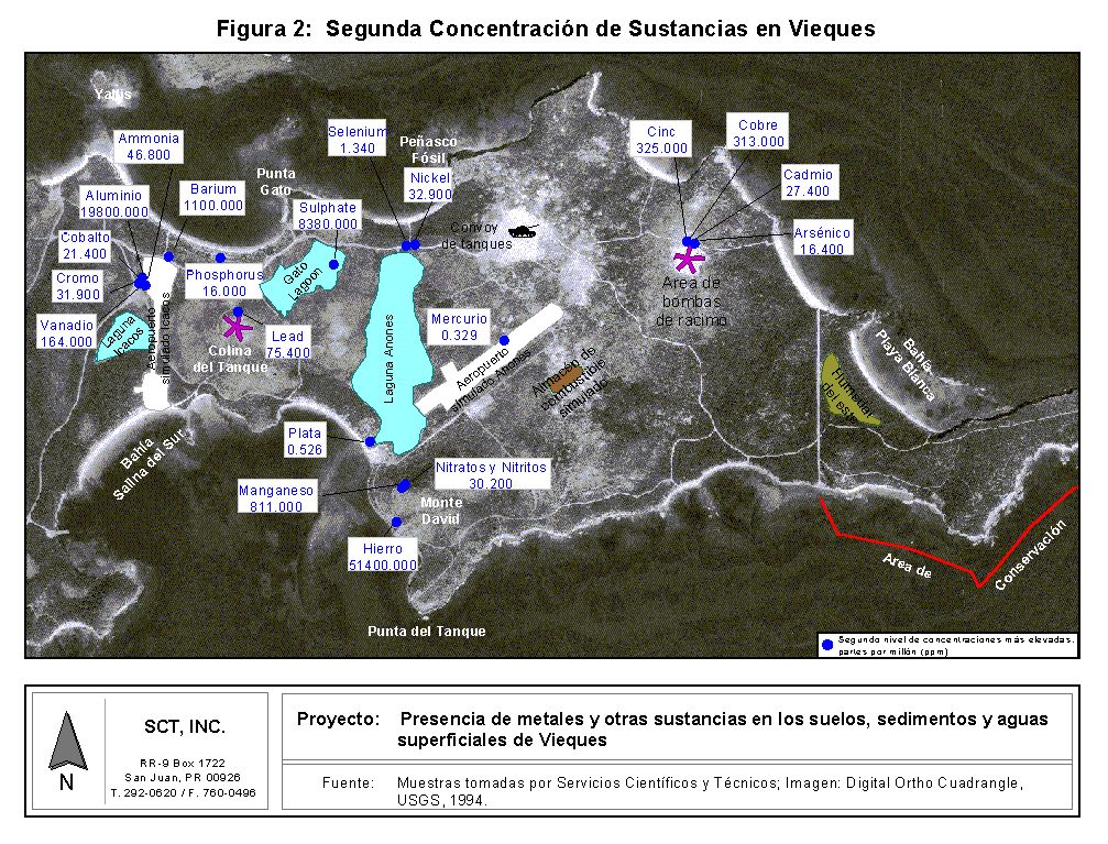 El análisis de 66 muestras obtenidas en Vieques durante el último año arroja la presencia de metales, otros elementos y sustancias químicas en elevadas concentraciones en comparación con muestras en las áreas de conservación del este y civil. Las concentraciones elevadas están asociadas a las áreas de impacto directo, cráteres y puntos bajos en los caminos y las lagunas Anones y Gato, en las que se acumulan sedimentos que provienen de las primeras. Las concentraciones elevadas aparecen en distintas formaciones geológicas y están asociadas a las actividades de disparos a diversos objetivos por la Marina (ver Tabla 1).