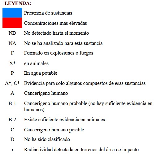 Los metales que se han encontrado en concentraciones elevadas, comparadas con lugares a los que no se hacen disparos, son: arsénico, bario, cadmio, cinc, cobalto, cobre, estaño, mercurio, plata y plomo. Las concentraciones de aluminio, cromo, hierro, manganeso, níquel y vanadio, encontradas en ciertos lugares son el resultado, en parte, de las actividades de la Marina. También se encontraron concentraciones elevadas de nitratos, nitritos, amoniaco, hidrocarburos típicos del diesel y fosfatos, que se forman a partir de las explosiones de las bombas o están presentes en otros artefactos bélicos.